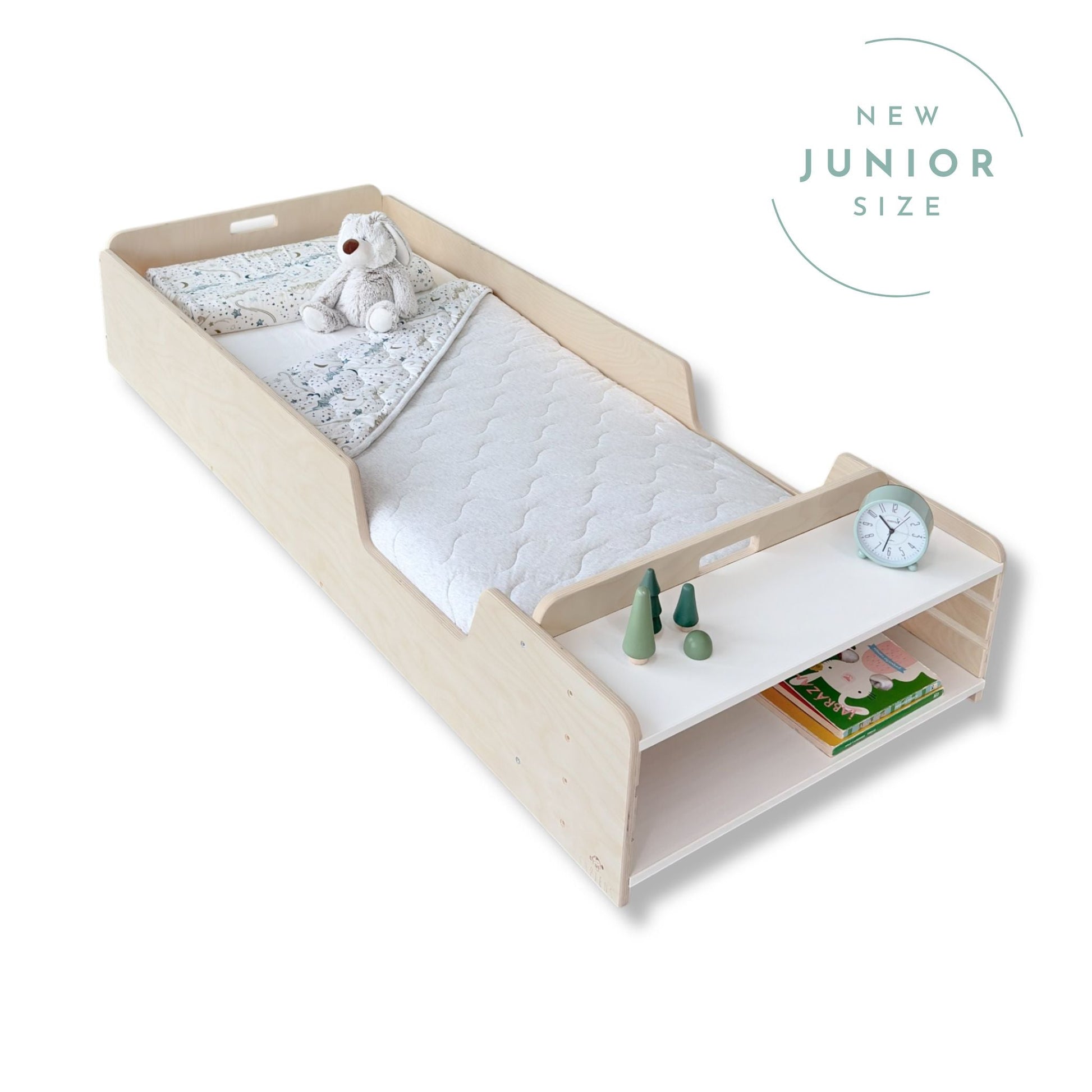 APPLE JUNIOR - Montessori Floor Bed with Rails & Shelves